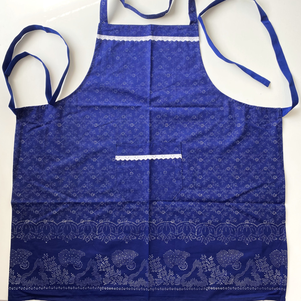 Kékfestő bordűrös kötény ágas mintával, csipkével