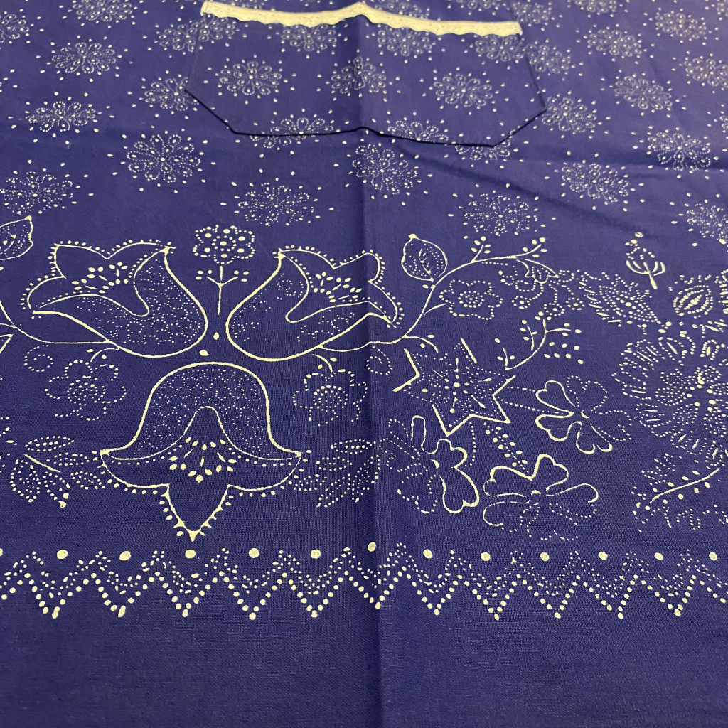 Eredeti kézzel mintázott bordűrös kékfestő kötény, "nagy hólabdás" mintával,csipkével.
