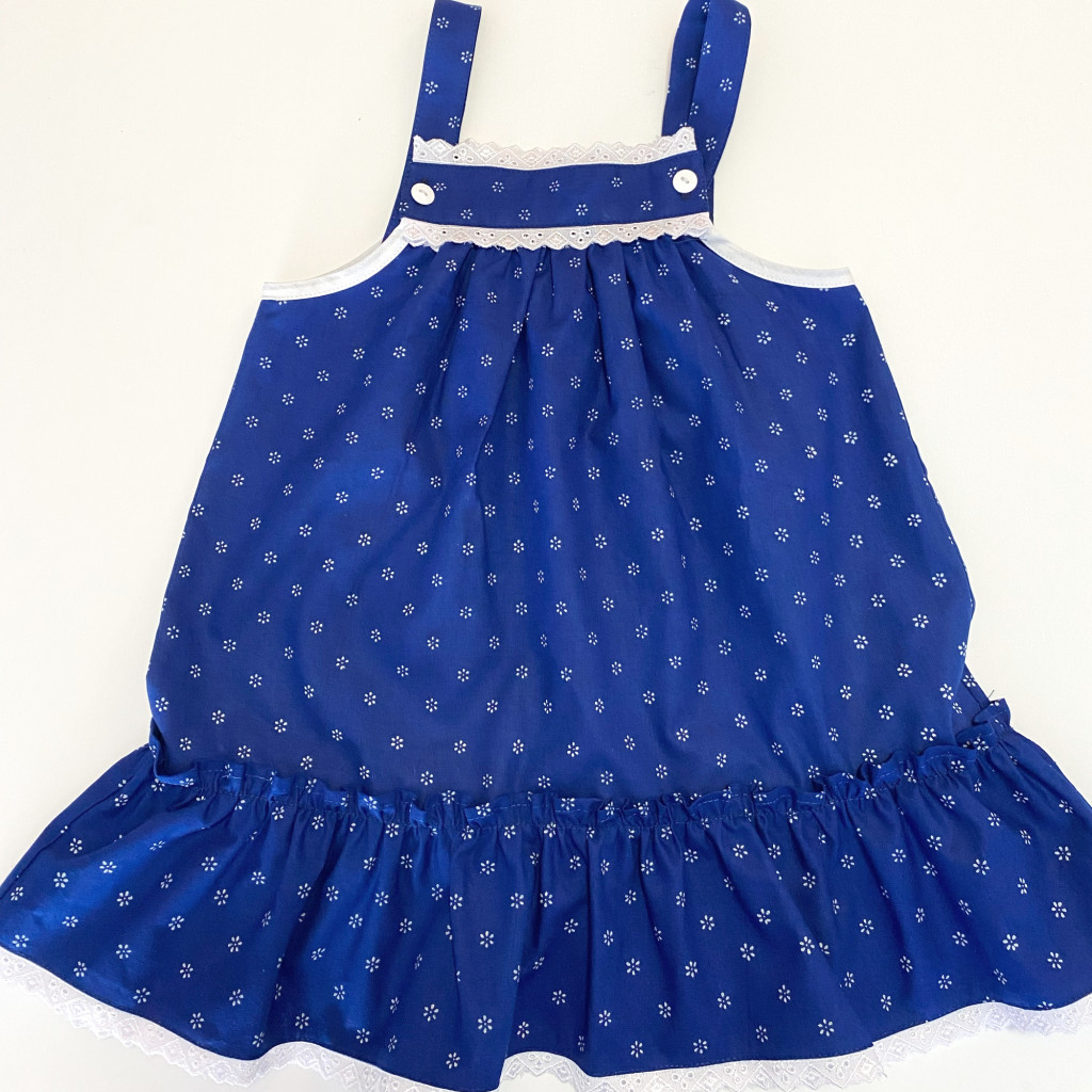 Kékfestő pántos gyerek ruha több méretben csillagvirágos mintával